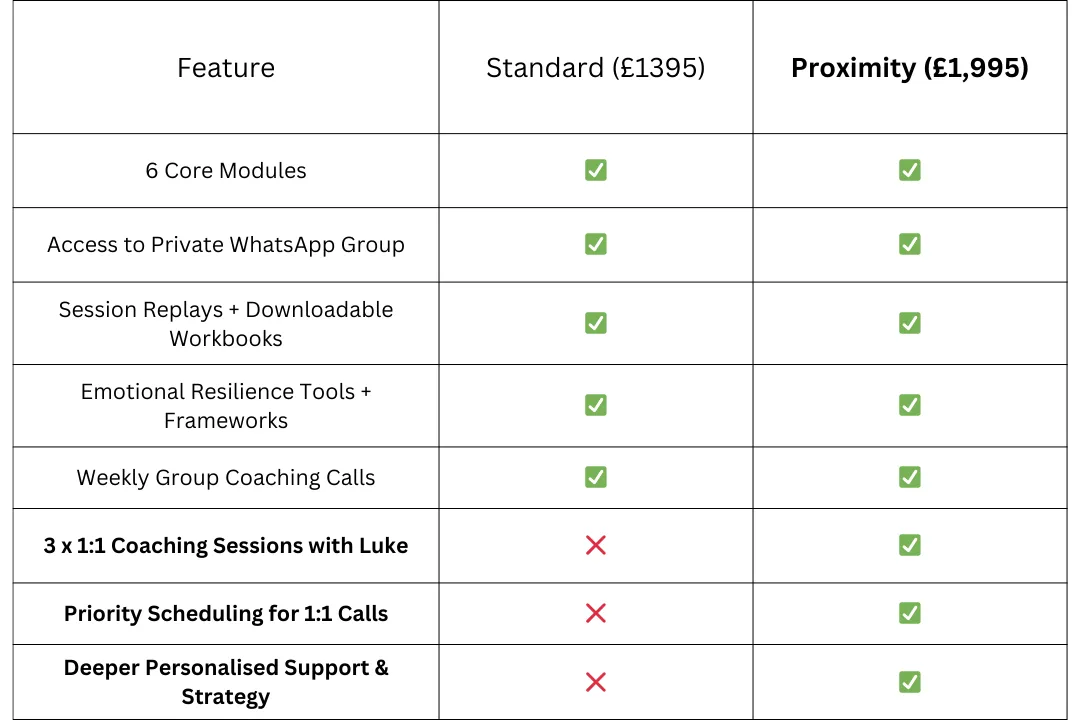 That’s exactly what the Proximity version is designed for. It gives you everything from the group program plus three private 1:1 sessions with Luke to go deeper into your personal journey.
